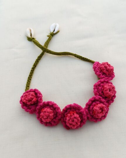 Handmade Crochet Rose Hair Accessory – Pink Floral Bun Wrap with Cowrie Shell Accents