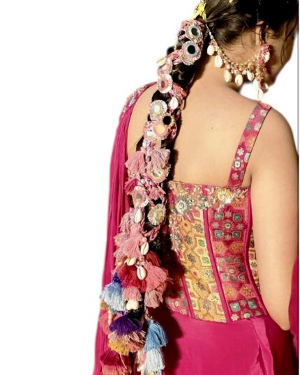 This handcrafted hair accessory features cascading turquoise and indigo braids adorned with shimmering Gota-patti mirrors and authentic cowrie shells. *
