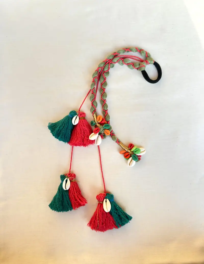 Bohemian Cowrie Shell & Tassel Hair Charm – Sage/Crimson