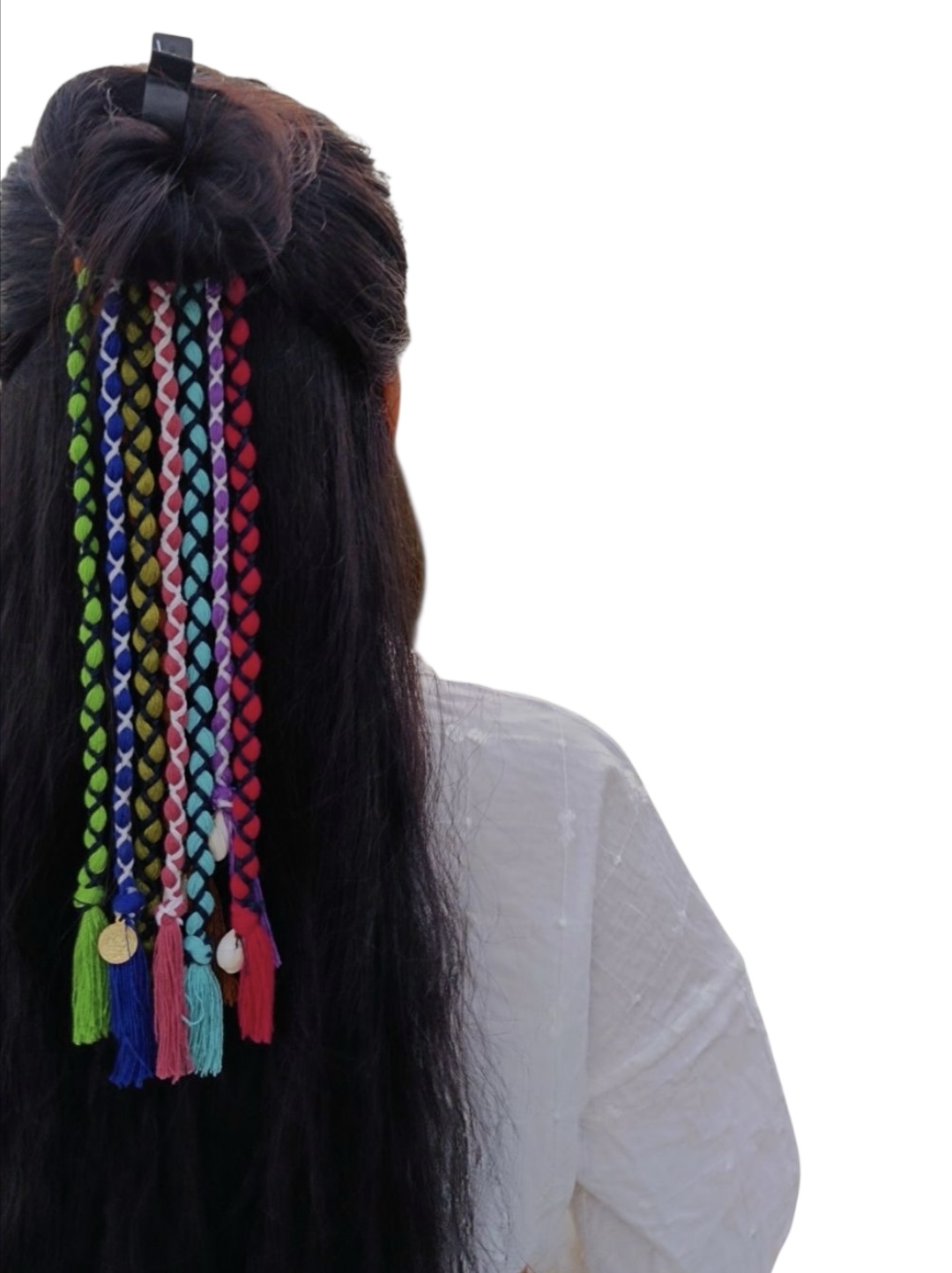 This vibrant parandi is a celebration of color, featuring a diverse array of hand-braided strands in neon green, electric blue, rich magenta, and soft teal. Designed to be as bold as it is beautiful, this accessory is the perfect way to express your unique style at festivals, weddings, or in your everyday rotation.