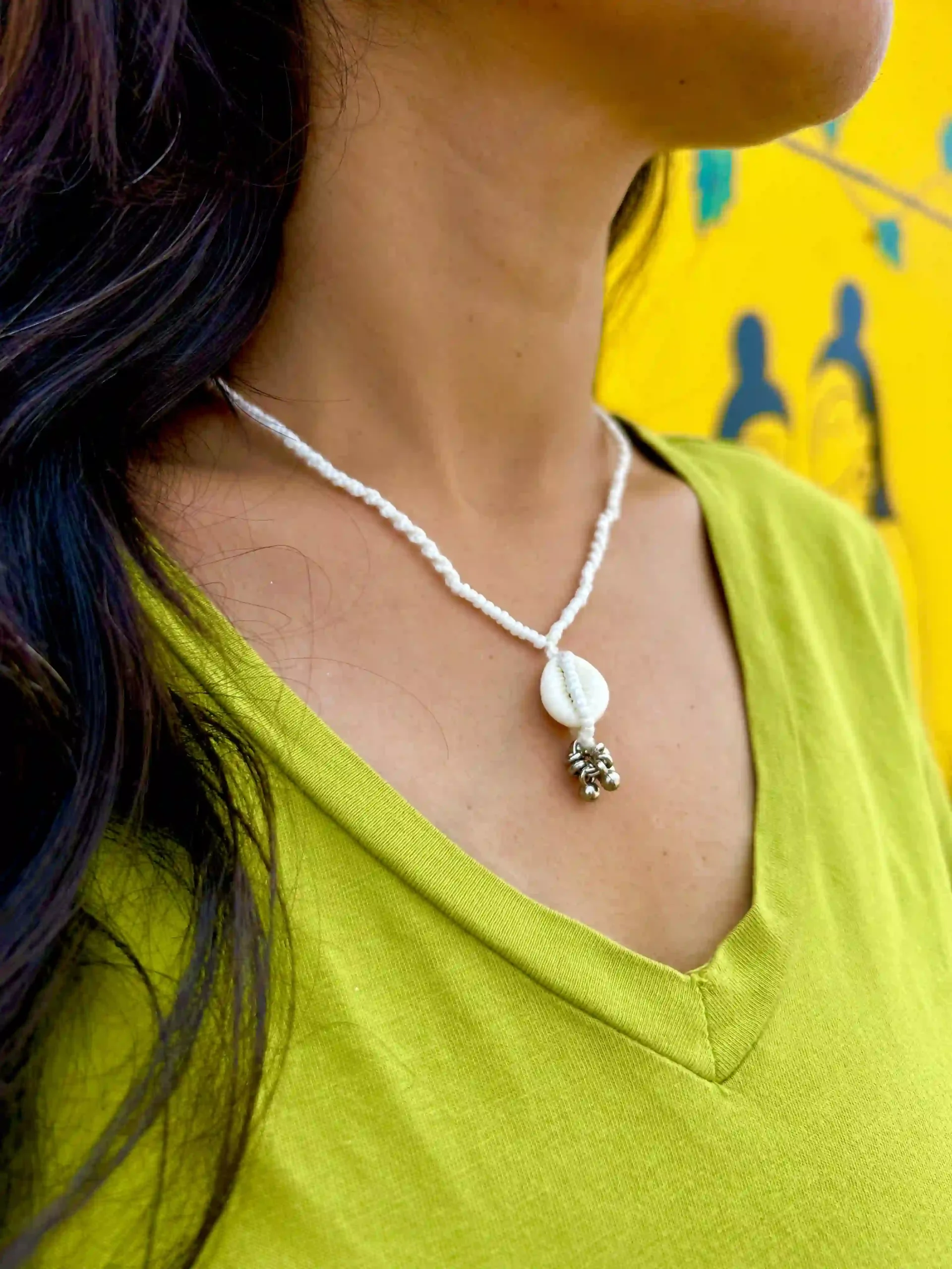 Be the first to review “Hand-Beaded White Cowrie Shell Necklace with Silver Bell Charms” Cancel reply