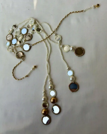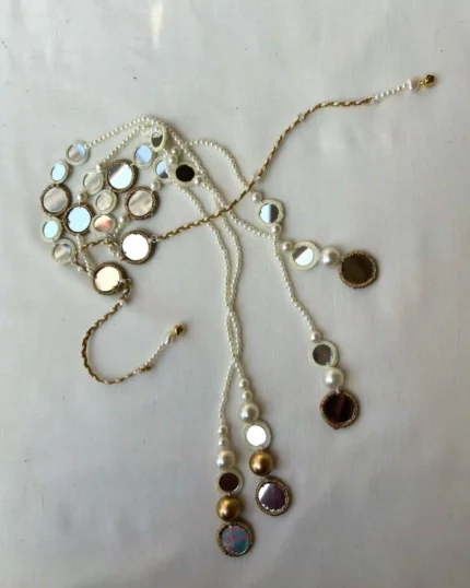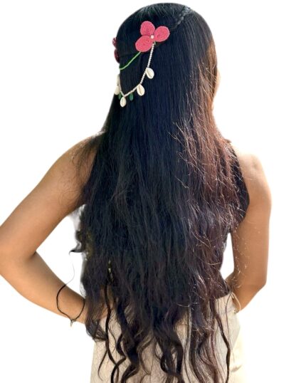 This unique hair accessory features a vibrant, hand-crocheted red heart edged with delicate white beading. Falling from the heart are elegant gold-toned chains finished with genuine white cowrie shells, creating a beautiful swaying motion as you move.